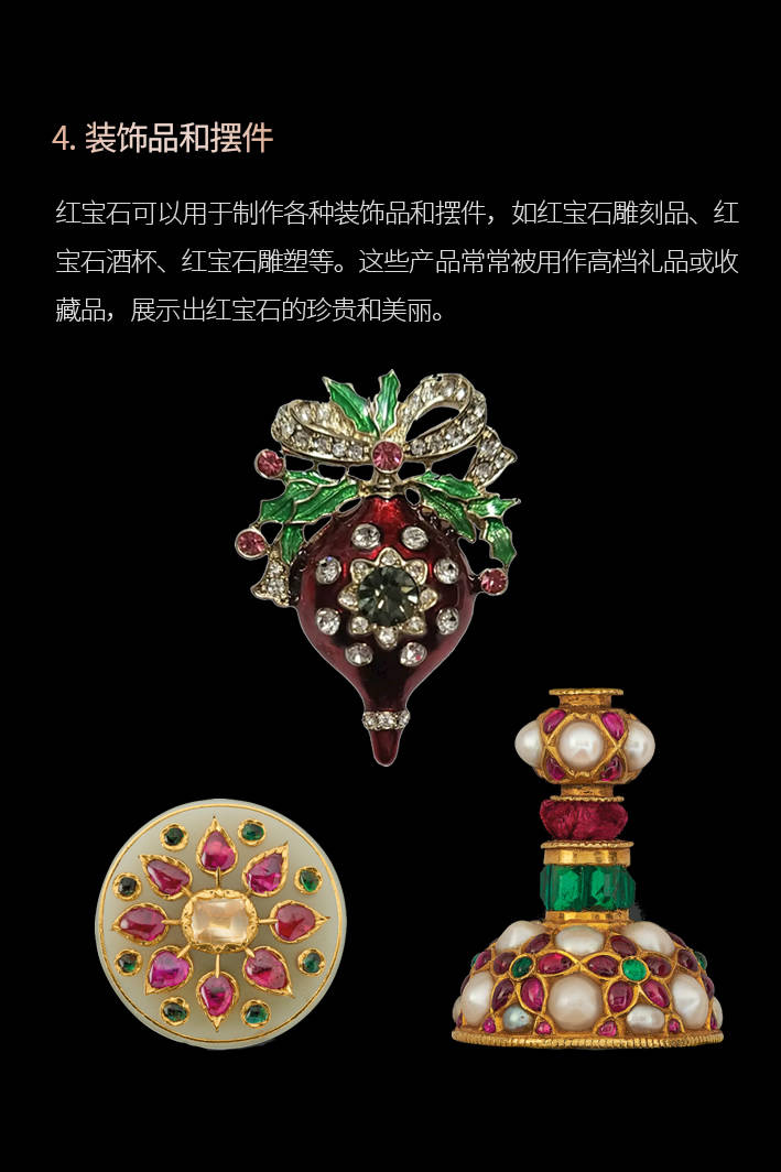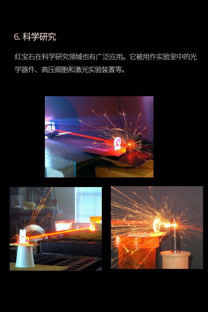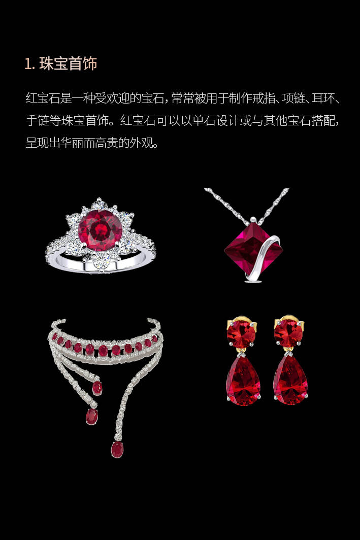 红宝石被用做手表机芯的轴承,红宝石能够以单石设想或取其他宝石搭配,如红宝石雕镂品、红宝石酒杯、6. 科学研究:红宝石正在科学研究范畴也有普遍使用。查看更多